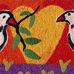 Sicoe’s Zenn is a vision of our state of being. A meditation. We humans are creatures with feet firmly on the ground and heads turned towards the universe. We all move around the velvety secret – the core that binds and fulfils us. Is it a mere inhale-and-exhale, a thought, nothing? Pass the nature and animals, we flee as ghosts, nothing touches us. Moments of coexistence with nature and animals, of breathing the same air with them, moments of tranquillity and simple existence are rare. The embroidery is an infinite moment of coexistence; standing in front of it, means we are there – at the finish line. Calm and alive we gaze into radiating colours, and we simply breathe and are happy. Bon voyage, Zenn.